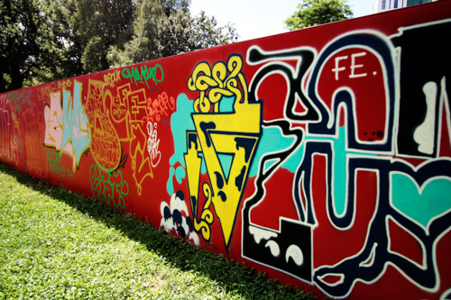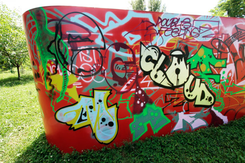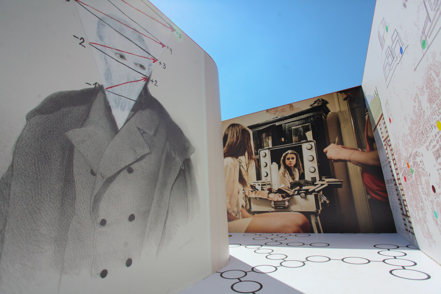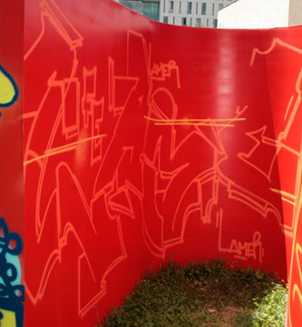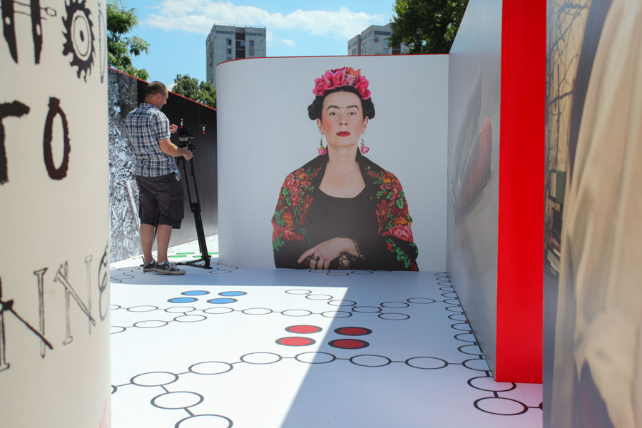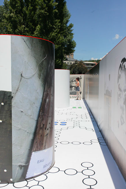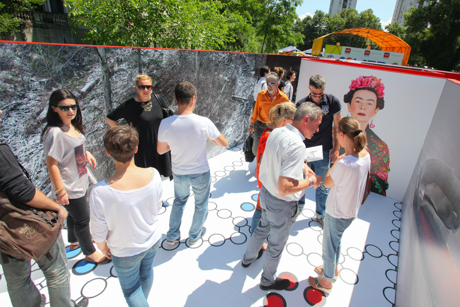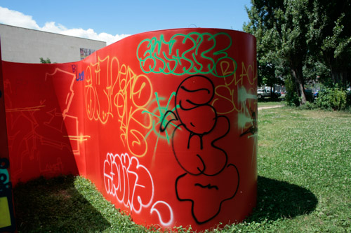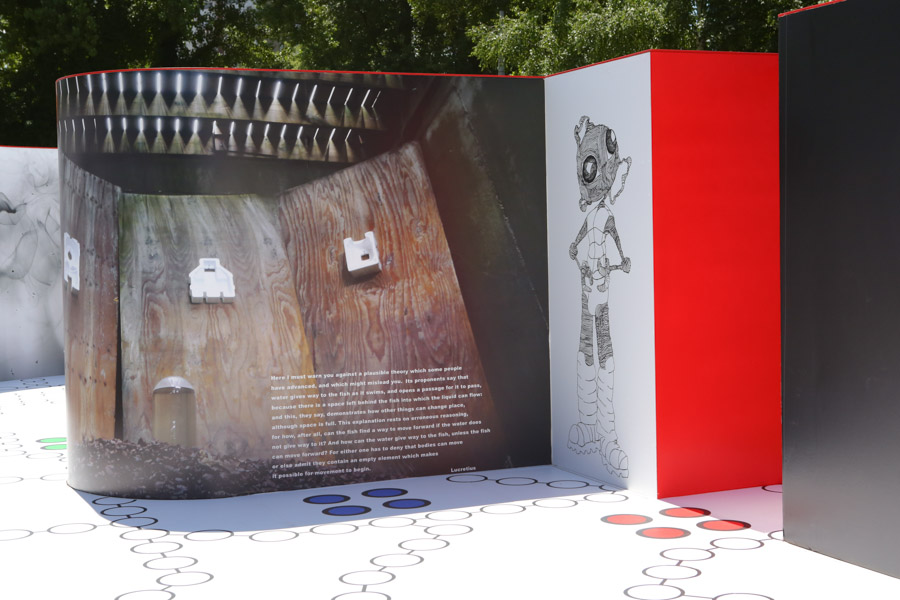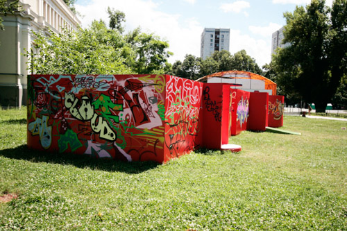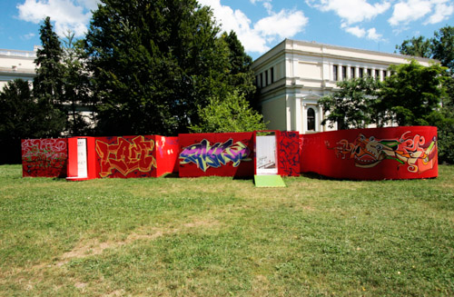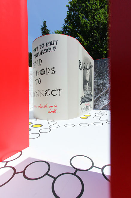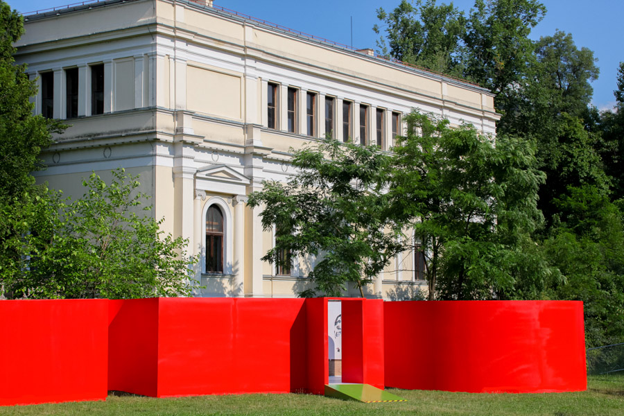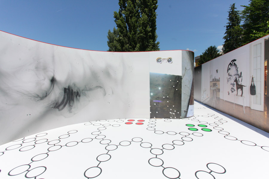 A: As a 21st Century Trojan horse where a dirty word is presented as a 20th modernist sculpture enclosed with its’ minimalistic architecture and painted ruby red on the outside. But when one enters they find themselves surrounded by the imagery of 14 contemporary artists of today, in a visual labyrinth without a roof with open skies above. On the floor, the Austrian artist Patrick Baumüller re-designed a circle pattern from the German children’s game, “trouble”, to depict the four major dialects spoken in the BiH region. As visitors enter the sculpture they will automatically be “in the game”, standing on the various colored circles of the floor, and going from one to another as they move through out the space, they realize that they are the only objects in the space and there-by becoming part of the Arts’ (sculpture’s) content.