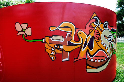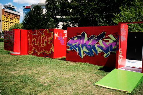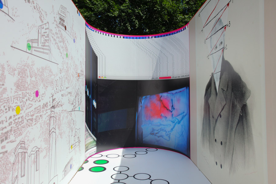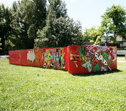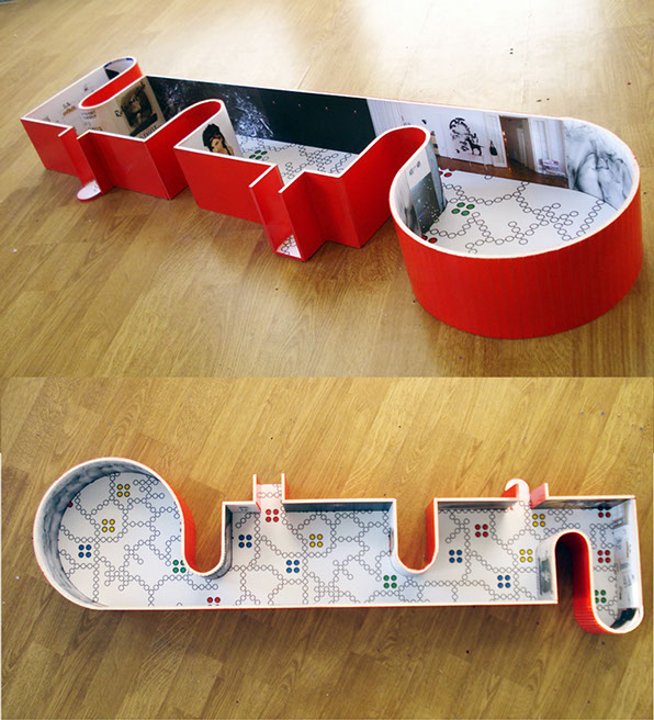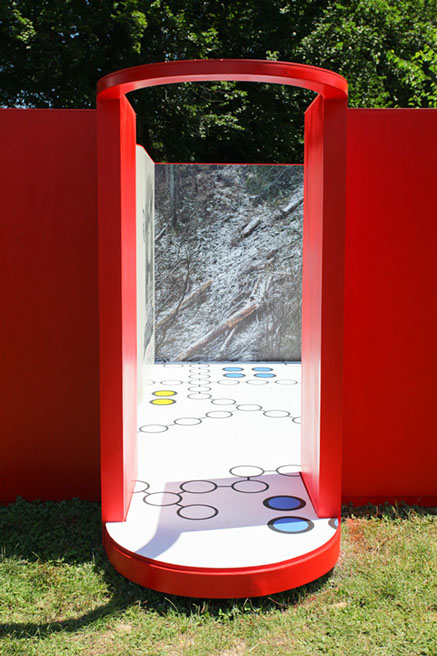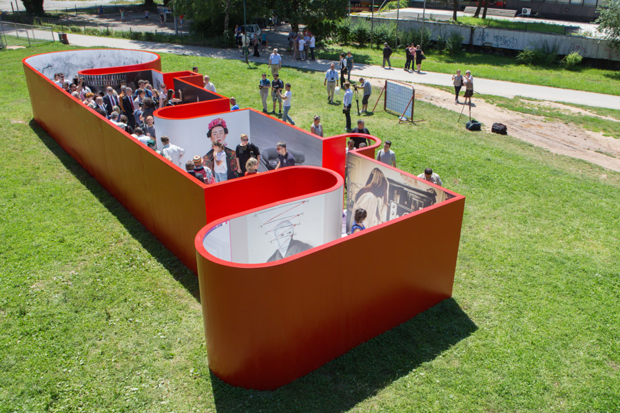 A: As a 21st Century Trojan horse where a dirty word is presented as a 20th modernist sculpture enclosed with its’ minimalistic architecture and painted ruby red on the outside. But when one enters they find themselves surrounded by the imagery of 14 contemporary artists of today, in a visual labyrinth without a roof with open skies above. On the floor, the Austrian artist Patrick Baumüller re-designed a circle pattern from the German children’s game, “trouble”, to depict the four major dialects spoken in the BiH region. As visitors enter the sculpture they will automatically be “in the game”, standing on the various colored circles of the floor, and going from one to another as they move through out the space, they realize that they are the only objects in the space and there-by becoming part of the Arts’ (sculpture’s) content.